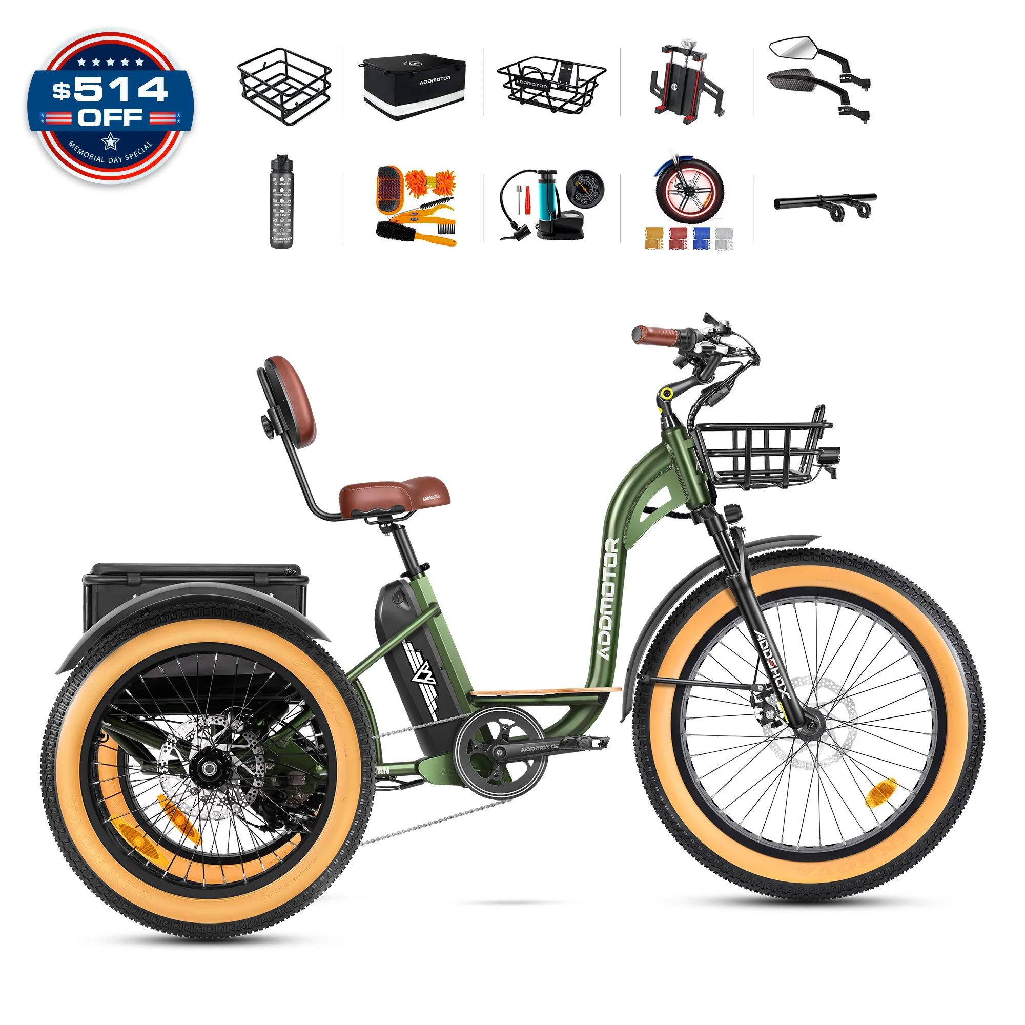 This electric trike is everything you've come to expect. The parking brakes make it safer. Plus Addmotor latest EB 2.0 electrical system, the M-366X is ready for your leisurely riding.